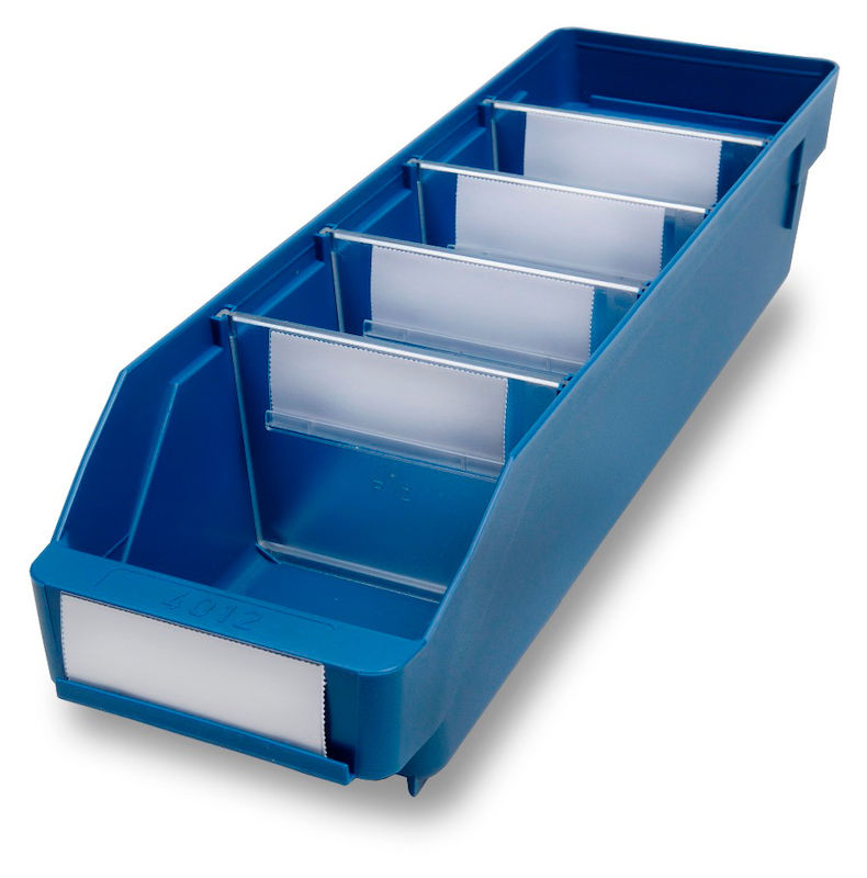 Lagerkasse Stemo 400x120x95 mm, 30-pak blå. Lagerkasse Stemo, 30-pak. Smarte reoltilpassede lagerkasser til forskellige hyldedybder, der passer til alle typer reoler.