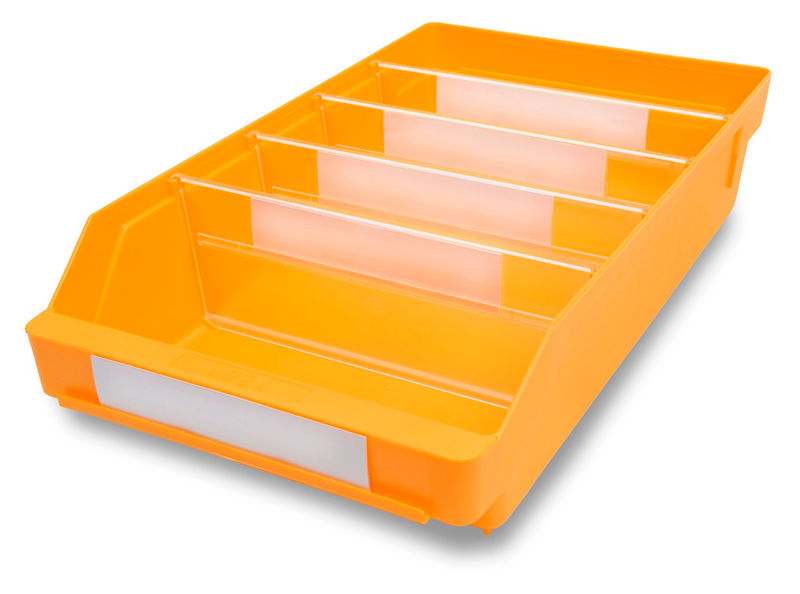 Lagerkasse Stemo 400x240x150 mm, 10-pak gul. Lagerkasse Stemo, 10-pak. Smarte reoltilpassede lagerkasser til forskellige hyldedybder, der passer til alle typer reoler.