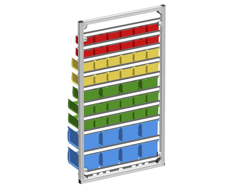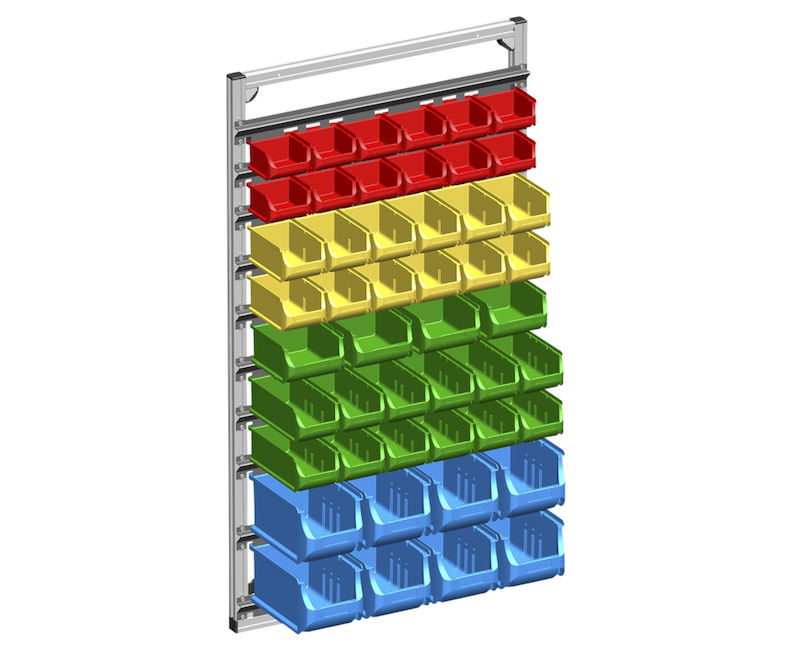 Vægreol med plukkasser Nalia, HxB 1190 x 660 mm, med 48 kasser. - Bredde: 660 mm - Materiale: aluminium - Massemateriale: PP - Stelfarve: sølv - Højde: 1190 mm - Dybde: 270 mm - Kasser, antal / LxBxH: 12 x rød / 102 x 100 x 60 mm 12 x gul / 102 x 160 x 75 mm 4 x grøn / 137 x 160 x 82 mm 12 x grøn / 102 x 215 x 75 mm 8 x blå / 150 x 235 x 125 mm
