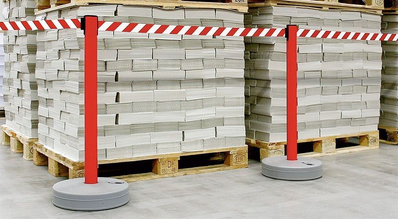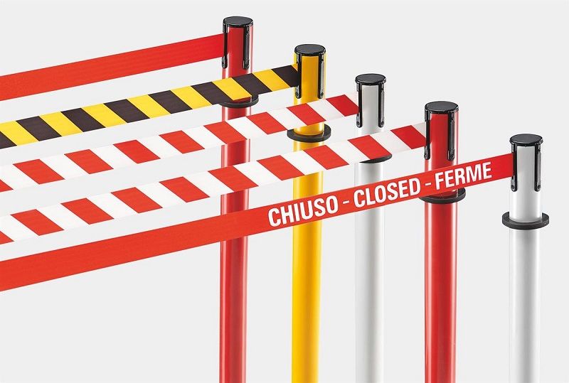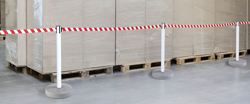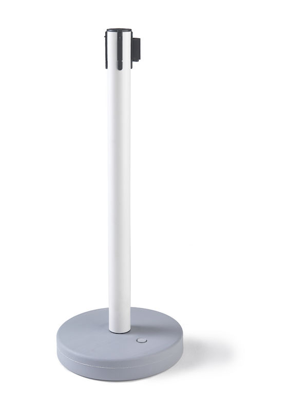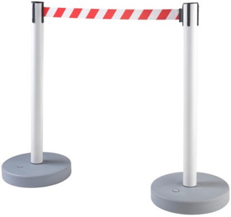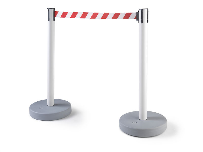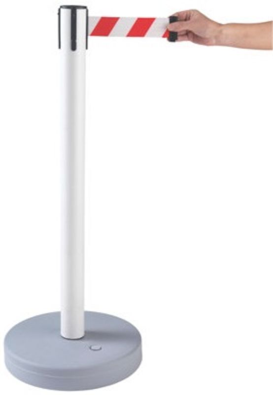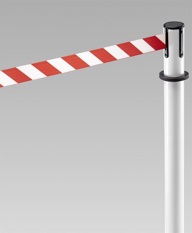 Afspærringsstolpe med bånd Melinda, til indendørs og udendørs brug, udtræk 3700 mm, hvid stolpe, rødt / hvidt bånd. Båndbredde 50 mm.