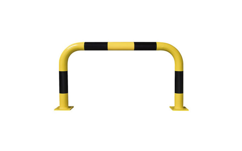 Påkørselsværn med robuste bøjler af kvalitetsstål. En kraftig beskyttelse til sikring af mennesker og inventar. Bøjlens diameter er 76 mm og godstykkelsen er 3 mm. Med bløde bøjninger – ingen svejsede sammenføjninger. Bundpladen ((160x140x10 mm) kan boltes fast. Fra 750 mm bredde, med sorte signalstriber. Påkørselssikringen til indendørsbrug er grundmalet, udendørs modeller er varmgalvaniseret. Alle (over 750 mm) er overtrukket med gul plast og sorte signal striber.