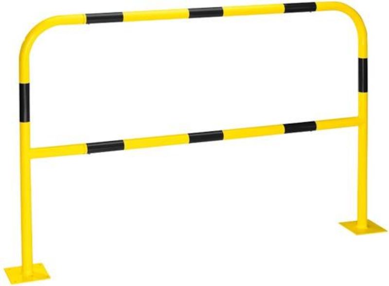 Påkørselsværn, beskyttelsesbøjle, til fastboltning, gul / sort coating, L 1500 mm. Til farezoner i produktionsområder Kan også anvendes udendørs Med knærør. Højde over gulv 1000 mm. Af stålrør, ø 42,4 mm, varmgalvaniseret eller desuden pulverlakeret i farver. Med gulvplade 150 x 150 mm til fastboltning eller til nedstøbning (dybde under gulv 200 mm). Tidligere varenummer: 738953. Leveres umonteret, enkel montering med stilleskrue.