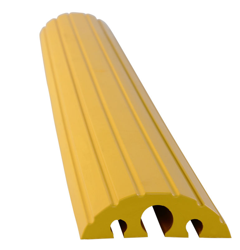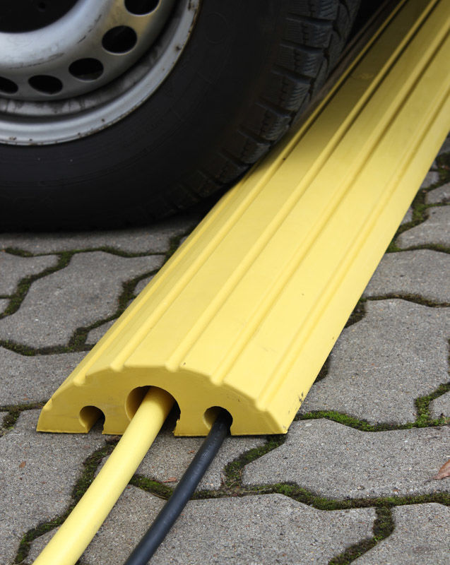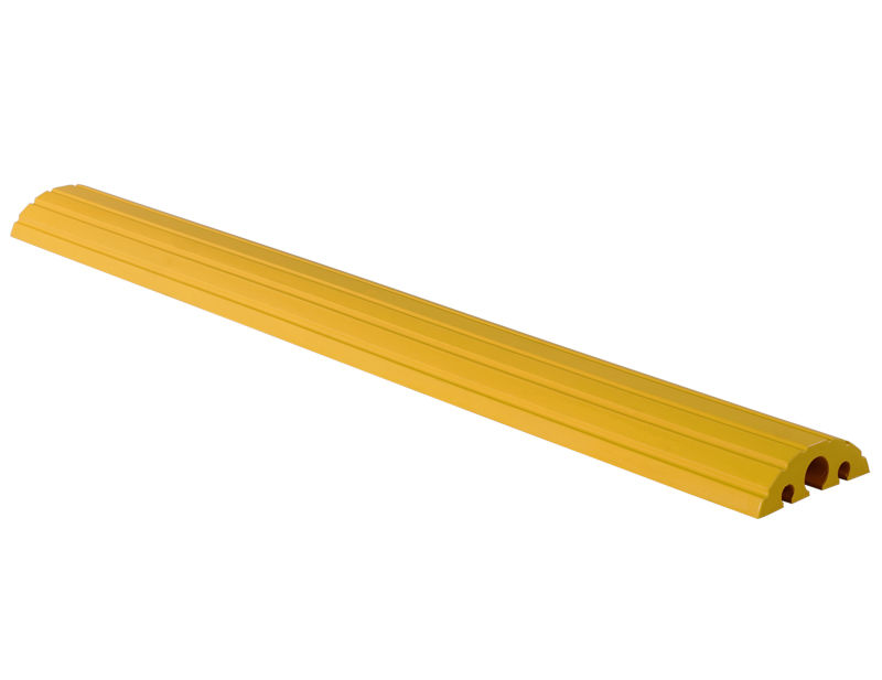 Kabelbro Tennan, gummi, LxBxH 1500x210x65 mm, gul. Kabelbro Tennan som beskytter både kabler og ledninger i trafikerede områder. Kabelbro Tennan ligger stille ved overkørsel på grund af undersidens udforming som forhindrer at den glider. Producert i gummi, gennemfarvet nyt materiale som gør kabelbroen ekstremt holdbar og giver lang levetid. Kan anvendes inden- og udendørs, både vinter og sommer. Har 3 kanaler, 2 stk Ø20 mm og 1 stk Ø40 mm.