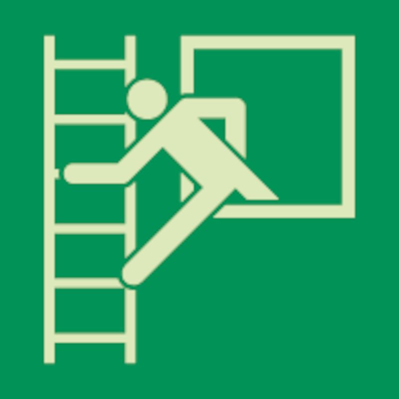 Nødskilt selvlysende, flugtvej med brandstige, 200x200 mm, aluminium, 10-pk. Selvlysende skilte giver hurtigt og nemt information og vejledning ved nødsituationer. Skilte i aluminium eller plast. Fremstillet i henhold til ISO 7010/ASR A3.3. Placeres synligt og ifølge gældende regler. Findes som enkeltsidet. Lyskraft 55 mcd/m2, 2 gange højere lyskraft end kravene i henhold til DIN-norm 67510. Uv-sresistent - til indendørs- og udendørsbrug. Det selvlysende materiale lyser i mørket efter opladning i dagslys, LED eller anden lyskilde.