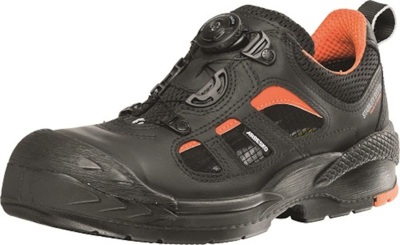 Sikkerhedssko Arbesko 342, Boa snøresystem, str. 45. Slidstærk og komfortabel sikkerhedssko med aluminiumstålkappe og sømværn uden metal. Overdel produceret i fuldnarvet impregneret Super8-skind. Slidbeskyttelse af PU over tæerne. Foret er af luftig mesh, hurtigtørrende materiale (Cambrelle) i hælen og under snørepartiet. Bindesålen er udstyret med stålskinne i svangen for at give skoen støtte og stabilitet. Kombinationen af Ortholite X-40 Duo indlægssåle og Energy Gel 2.0 i hælen giver god støddæmpning og affjedring. Slidsålen er af asymetrix og funktionssåle af PU med nitrilgummi i hælen. Meget bred læst, popuLæder sko hos byg- og anlægsarbejdere.