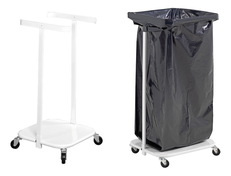 Affaldsstativ med hjul, hvidlakeret metal, med 4 drejelige hjul, 240 liter. Stativ i hvidlakeret metal med 4 drejelige hjul til affaldssæk. Fås i tre størrelser, 60, 125 og 240 liter. Leveres i kasse.