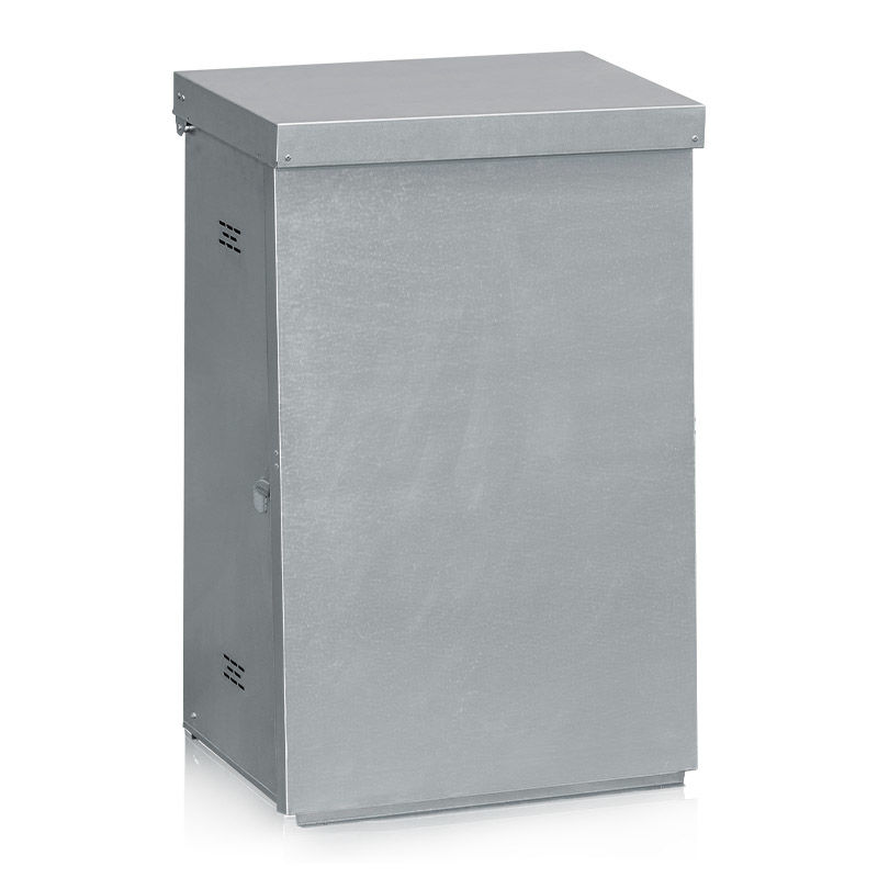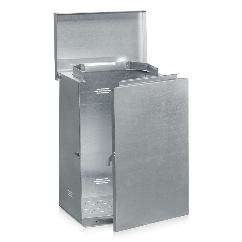 Afffaldsbeholder, stål, 125 – 160 liter. Affaldsbeholder i galvaniseret metalplade. Enkel, aftagelig front. Til sække med størrelse 125-160 liter.