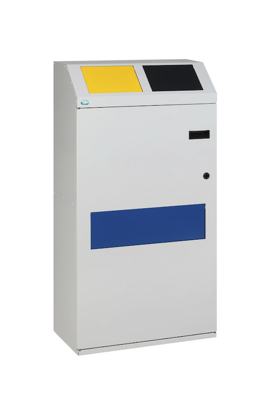 Den praktiske låge med sikkerhedslås (inklusive 1 nøgle) og integreret håndtagsfordybning giver sikker adgang og intuitive betjeningsegenskaber. Farvede, selvlukkende indkastklapper gør det nemt at sortere forskellige genbrugsmaterialer og gør sorteringen effektiv.