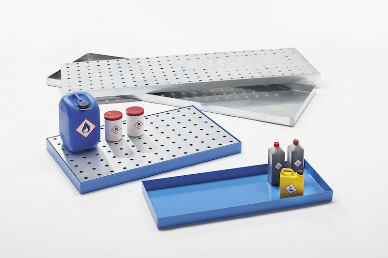Opsamlingskar Evert, LxBxH 1850 x 600 x 60 mm, godkendt, opsamlingsvolumen 60 l, galvaniseret. Godkendt til brandfarlige væsker i GHS-kategori 1 – 3 og til vandforurenende væsker i GHS-kategori 1 – 4. Fremstillet af tætsvejset 3 mm stålplade.
