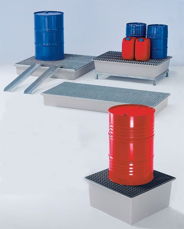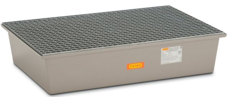 Opsamlingskar i glasfiberarmeret plast til paller, med forzinket rist, LxBxH 1280 x 850 x 270 mm. Yderst modstandsdygtig mod olie, kemikalier (syre, lud), emulsioner og rengøringsmidler med pH-værdi op til 8 Til sikker og forskriftsmæssig opbevaring af vandforurenende væsker i GHS-kategorierne 1 – 4 Også godkendt til brændbare væsker (flammepunkt 55 °C) Med almen godkendelse Z-40.12-227 fra DIBt i Berlin Lav højde til enkel håndtering af tønder Er korrosionsbestandig og kan derfor stilles direkte på gulvet. Opstilling enkeltvist eller i områdedækkende samlet system. Til 60 og 200 liters tønder. Med galvaniseret stålgitterrist.