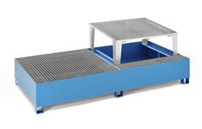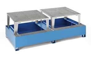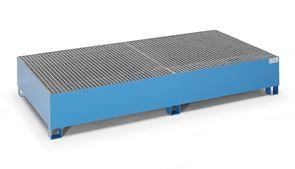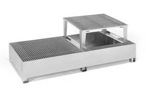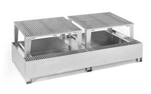 Opsamlingskar Rufus, til 2 x 1000 l container, 1 tappeenhed, varmgalvaniseret. Vores stålopsamlingskar til tankcontainere IBC/KTC udgør en ideel løsning til sikker opbevaring og påfyldning af brændbare og vandforurenende væsker. Opsamlingsbakkerne er fremstillet af tætsvejset 3 mm stålplade og opfylder de højeste standarder: De er certificeret i henhold til StawaR-overensstemmelseserklæringen (ÜHP) og godkendt til brandfarlige væsker i GHS-kategori 1 – 3 samt til vandforurenende væsker i GHS-kategori 1 – 4.