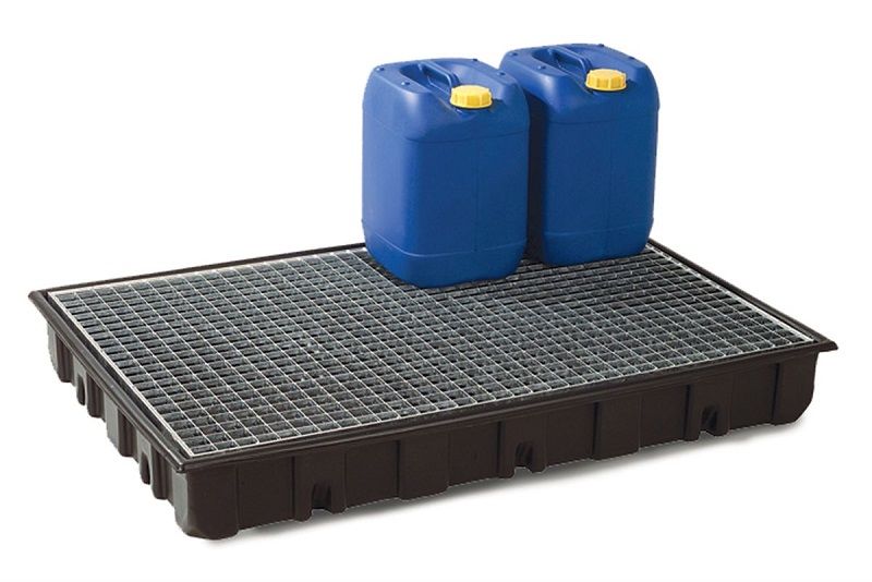Spildbakker til tønder og dunke, LxBxH 1230 x 830 x 160 mm eller 1220 x 820 x 270 mm. Kraftige Spildbakker til tønder og dunke tilpasset til placering på paller, hvilket medfører enklere flytning og opbevaring i pallereol. Fås med eller uden rist . Gitter fås i plast eller i galvaniseret udførelse.
