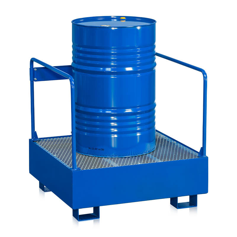Spildbakker, til stående tønder, med rist og rækværk, 1-tønde, 220 liter. Spildbakker og miljøskabe til stående og liggende tønder. Alle kar er fremstillet af 3 mm metalplade og lakeret med rustbeskyttende, blå maling (RAL 5019). Gitterbund af varmgalvaniseret stål.