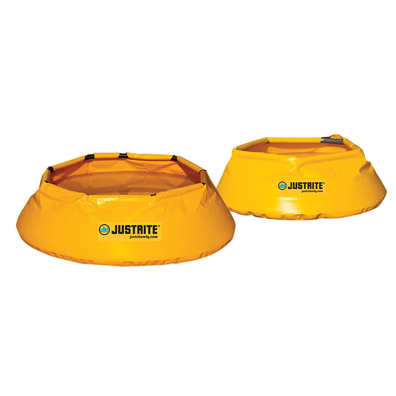 Spildbakke sammenfoldelig Justrite, Ø 1372 mm, volume 379 liter. Spildbakke der kan foldes ud til lækager under køretøjer, tromler, rør, ledninger og maskiner. Spildbakke til indendørs og udendørs brug. Hurtig beskyttelse mod lækkende væsker, der forhindrer frigivelse af kemikalier og olier i afløb og regnvandskilder. Spildbakken er lavet af meget slidstærk og modstandsdygtig vinyl. Vaskes med sæbeopløsning og genanvendes. Siderne retter sig ud, når de fyldes på grund af PU-skum ringen på overkanten af bakken. Meget nem at bruge. Fold ud, ryst og klar til brug.