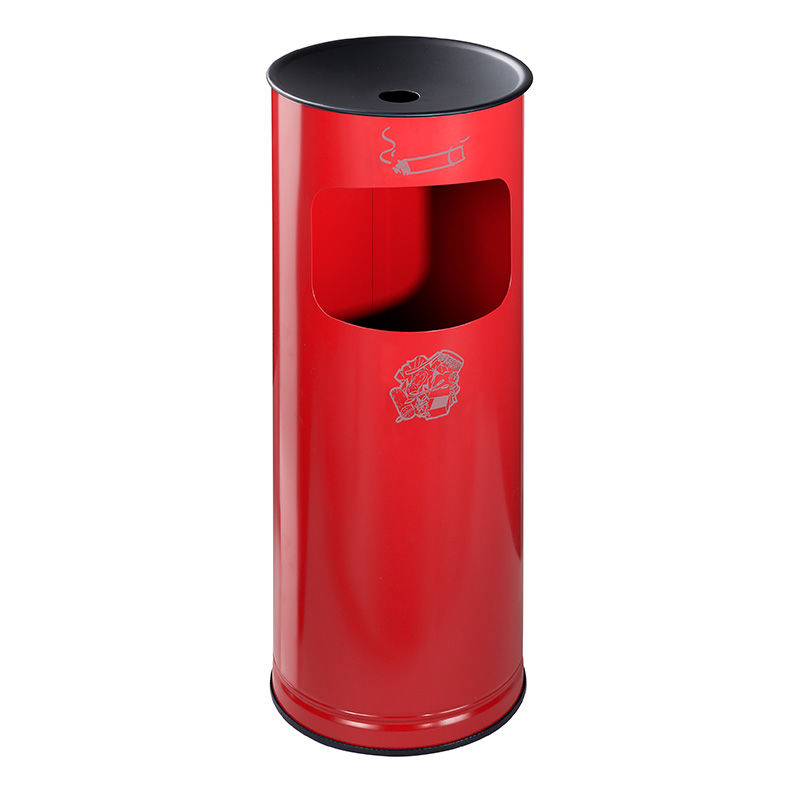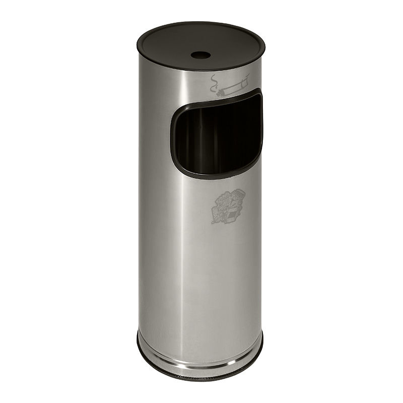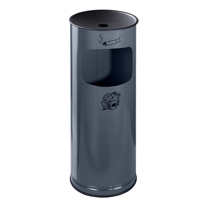 Udendørs askebæger med affaldsspand og cigaretskod beholder, galvaniseret og pulverlakeret. Det tragtformede låg tvinger cigaretskoddene til at glide ned i beholderen. Vha. den lille lågåbning forhindres udskiftning af ilten. Der opstår således ingen flammer og næsten ingen røg. Aftageligt låg af sortlakeret metal. Aluminiumopsamlingsbeholder til cigaretskodder. Bekvemt affaldsindkast vha. komfortabelt dimensioneret åbning. Korpus af elektrolytisk galvaniseret og pulverlakeret stålplade i høj kvalitet. Med kantbeskyttelse, der skåner gulvet. Affaldsvolumen 17 l, højde 610 mm.
