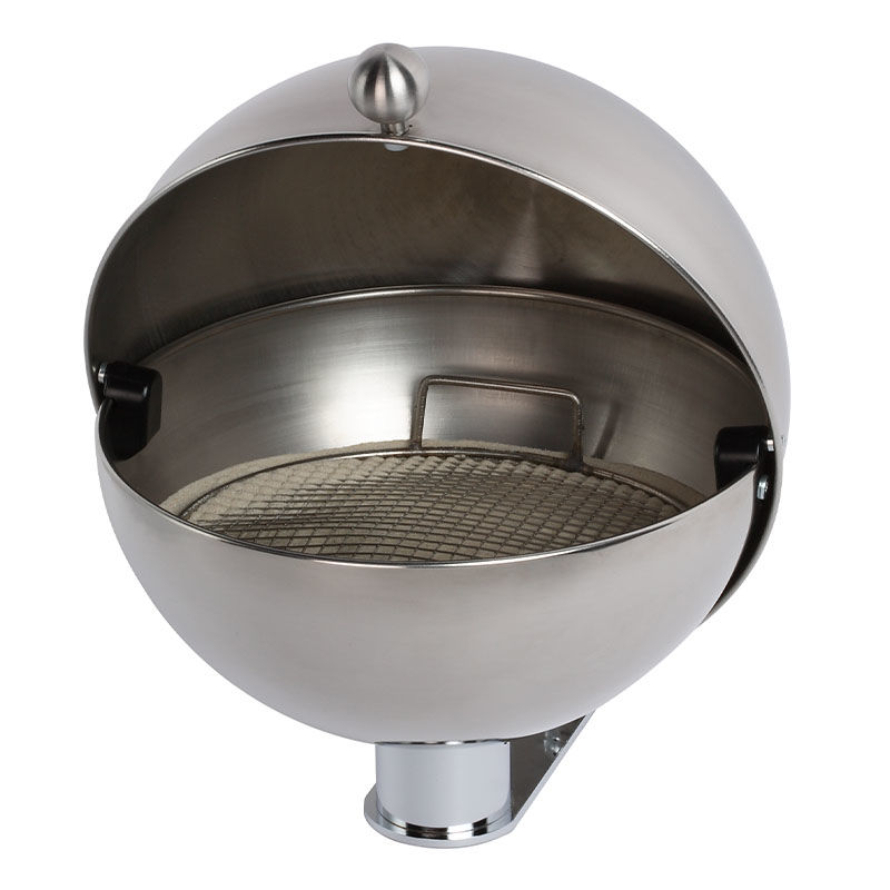 Kugleformet vægaskebæger i rustfrit stål, til vægmontering, HxBxD 280 x 260 x 300 mm. Skinnende kugle i rustfrit stål, der er let at åbne, til sandpåfyldning. Når askebægerkuglen skal tømmes, tages den blot af. Inklusive si og monteringsmateriale.