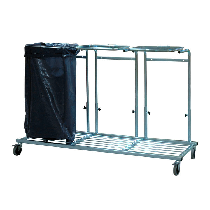 Affaldsstativ på 4 gummihjul med bremse, 125-240 liter. Affaldsstativet fås til 2 eller 3 sække og egner sig derfor perfekt til affaldssortering. Stativerne kan højdejusteres individuelt, hvilket gør, at man kan have sække med forskellig volumen ved siden af hinanden. Sækken klemmes fast med klemring for at opnå den største sikkerhed (uafhængigt af materiale). Passer til 125-240 liters sække vha. højdejustering på sækkeholderen. Vognene har 100 mm gummihjul med bremse. Låg købes som tilbehør.