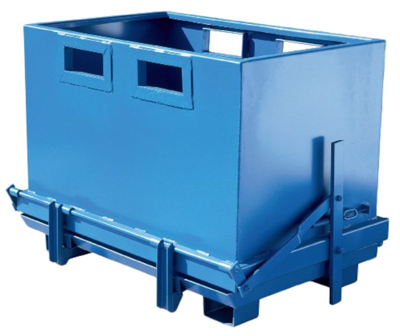 Container med bundtømning. Robust konstruktion hvor tømning forgår ved at hele bunden åbner sig op. Automatisk åbning og låsning efter tømning. Tømning skal ske ved hjælp af truck med modvægt eller støtteben. Flytbar med gaffeltruck eller gaffelløftevogn. Containerne kan stables.
