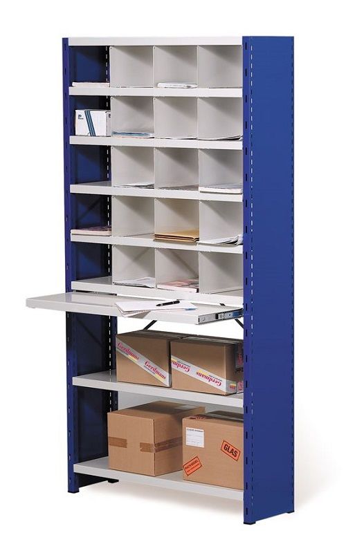 Postreol, 20 fag + aflastningsplade, H1960 x B1000 x D400 mm, blå/grå. Fleksibelt reolsystem. Du sammensætter reolen med udgangspunkt i dit opbevaringsbehov og lokalets udseende. Enkel samling. Reol med lukkede gavle. 20 fag + aflastningsplade.
