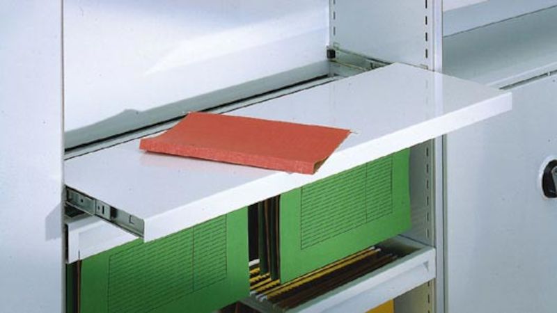 Udtrækkelig aflastningsplade til Gerdmansreolen, til hyldebredde 930 mm, lysegrå, til hyldedybde 400 mm. Helt udtrækkelig aflastningshylde med fast position i yderste og inderste position. Udform din hylde til arbejdsplads, f.eks. skrivepult, monteringsplads eller stilleflade. Hylden er forsynet med 2 stk. helt udtrækkelige kuglelejeophængte styreskinner, der hægtes fast i gavlene uden værktøj.