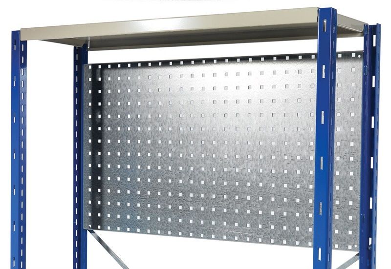 Værktøjstavle til Gerdmansreolen, L 930 x B 500 mm, galvaniseret. Hænges mellem reolens gavle i bagkanten.