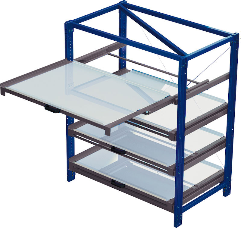Stabil ramme af stålstolper med tæt hulinddeling, der muliggør mange tilpasningsmuligheder. Lige velegnet fast installeret eller som en mobil opbevaringsløsning med hjul eller gaffeltruckskinner.