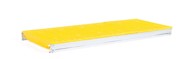 Hylde til lagerreol Flex inkl. hyldeprofil. Fremstillet af plast og stål. Velegnet til til frysemiljøer i fx fødevareindustrien og storkøkkener. 900x500 mm, plast gul.