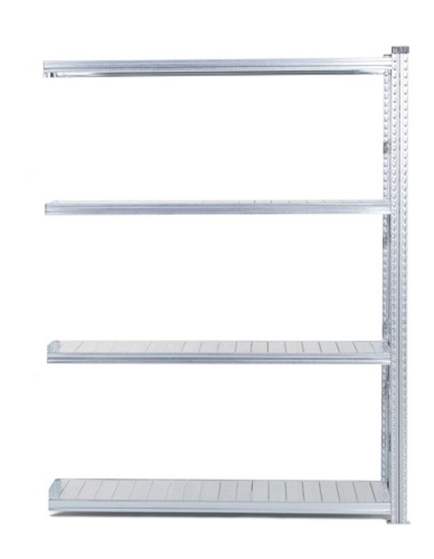 Lagerreol Flex, H 1972 mm tilbygningssektion BxD 1506x320, 4 stk galvaniserede hylder. Et fleksibelt reolsystem af galvaniseret stål med mange anvendelsesområder. Lav egenvægt – høj belastning, 135-350 kg/hylde. Flytbare bærebjælker, med 33 mm’s interval. Hylder til forskellige arbejdsmiljøer. Enkel at monterer (ingen bolte eller skruer). Kan anvendes fra begge side, da der ikke behøves stabiliserings kryds. Gavle levereres monterede, bærebjælker og metalfødder indgår i hver sektion.