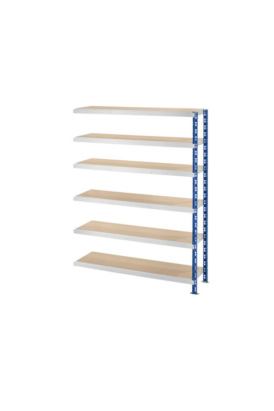 Lagerreol Juhani, dybde 400 mm, med spånpladehylder, tilbygningssektion, HxB 1976 x 1525 mm. Skruer og dyvler til fodpladerne medfølger ikke.