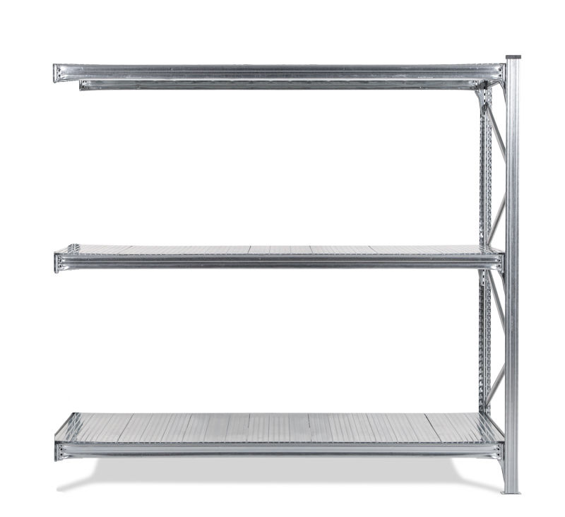Maxi reol tilbygningssektion, Hx2000x2120x1200 mm, galvaniserede hylder. Et fleksibelt reolsystem af galvaniseret stål tilpasset til pladskrævende og voluminøst gods. Lav egenvægt – høj belastning, 500 kg/hylde. Højde 2000, dybde 1200 mm. Flytbare bærebjælker, med 33 mm’s interval. Hylder i galvaniseret plade eller spånplade. Enkel at monterer (ingen bolte eller skruer). Kan anvendes fra begge side, da der ikke behøves stabiliserings kryds. Gavle levereres monterede, bærebjælker og metalfødder indgår i hver sektion