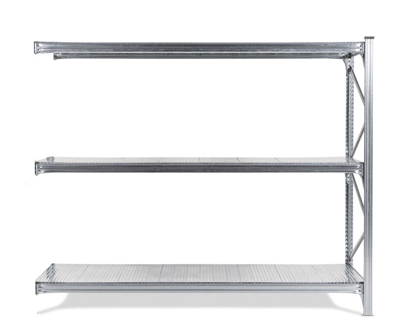 Maxi reol tilbygningssektion, Hx2000x2420x1000 mm, galvaniserede hylder. Et fleksibelt reolsystem af galvaniseret stål tilpasset til pladskrævende og voluminøst gods. Lav egenvægt – høj belastning, 500 kg/hylde. Højde 2000, dybde 1000 mm. Flytbare bærebjælker, med 33 mm’s interval. Hylder i galvaniseret plade eller spånplade. Enkel at monterer (ingen bolte eller skruer). Kan anvendes fra begge side, da der ikke behøves stabiliserings kryds. Gavle levereres monterede, bærebjælker og metalfødder indgår i hver sektion