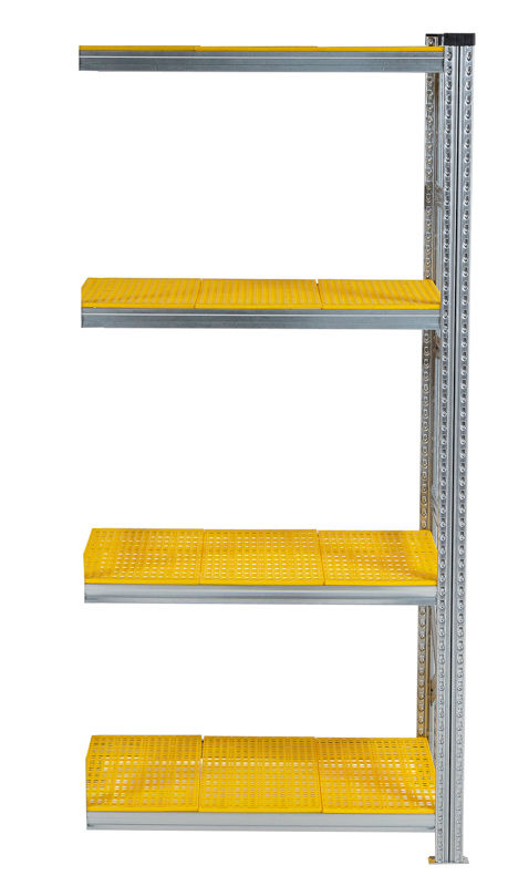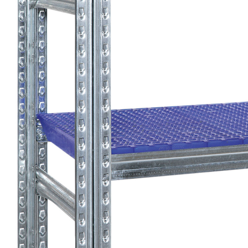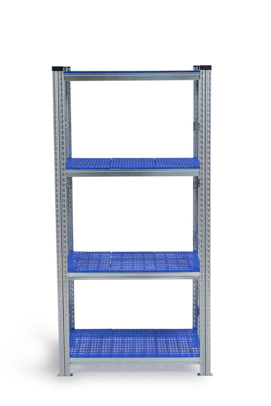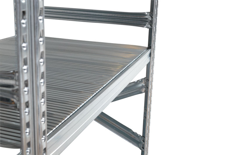 Lagerreol Flex med grønne perforerede plasthylder, til fødevareindustrien. En fleksibel, professionel stålreol / industrireol / opbevaringsreol af galvaniseret stål med mange anvendelsesområder. Lav egenvægt – høj belastning, 135-350 kg/hylde. Flytbare bærebjælker, med 33 mm interval. Hylder til forskellige arbejdsmiljøer. Enkel at samle, uden bolte eller skruer. Kan anvendes fra begge sider, da der ikke behøves stabiliseringskryds. Gavle leveres monterede, bærebjælker og metalfødder indgår i hver sektion. Køb en grundsektion og udvid med tilbygningssektioner. Plasthylderne er perforerede og kan således anvendes i miljøer med sprinklersytem da vandet kan løbe gennem hylderne. Alle hylderne er desuden fødevaregodkendte.
