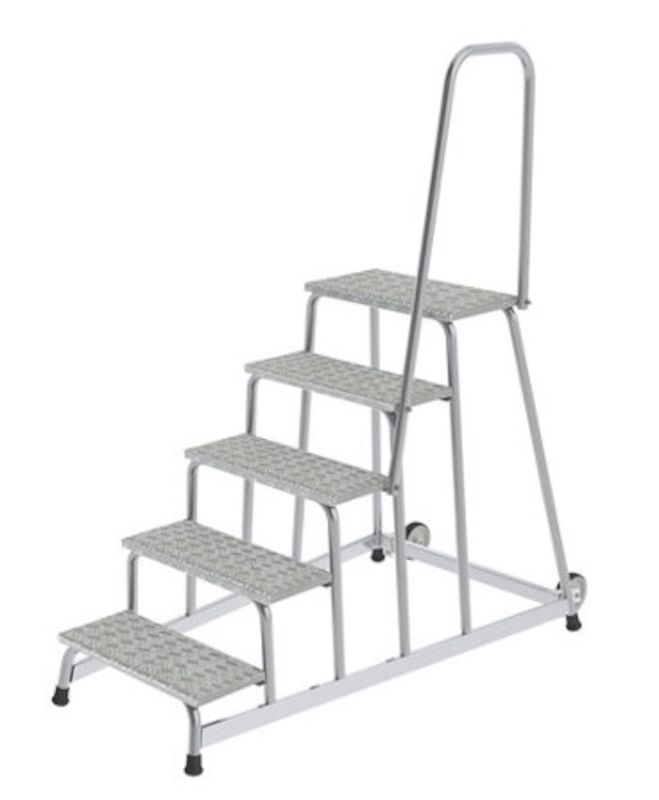 Arbejdsplatform med 2 faste hjul og gelænder i den ene side, 5 trin, BxD 840 x 1390 mm. Med trin af riflet aluminiumplade Ekstra stabile og solidt stående Svejset aluminiumrørskonstruktion Trin af skridsikker riflet plade, 225 mm dybe Øverste trin 550 x 300 mm Skridsikre plastfødder Høj sikkerhed vha. 900 mm højt gelænder i den ene side Kan køres vha. 2 faste hjul.