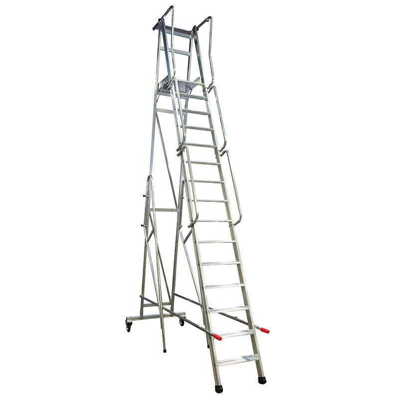 Udtrækkelige støtteben gør platformsstigen nem at manøvrere, samtidig med at der opnås maksimal stabilitet. Nem at flytte med kraftige hjul og gribevenlige håndtag. En rullende platformsstige til professionelle lavet til daglig brug.