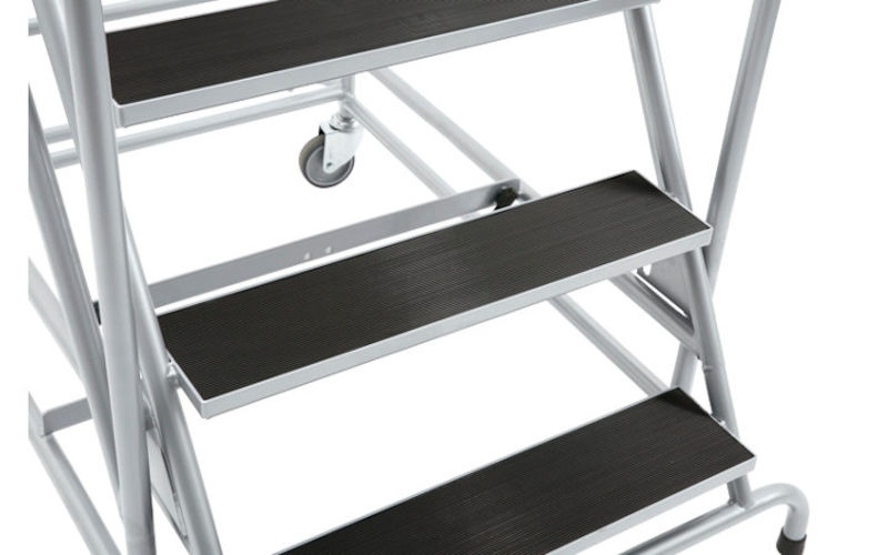 Trappestige med platform, på hjul, med platformsrækværk på 3 sider, med 6 trin. Ideel til vareudtagning fra reoler, reparationer på maskiner etc. Trin af riflet, skridsikker gummiprofil, 150 mm dybe Bred, stabil platform. Stabil metalkonstruktion, pulverlakeret i beige. Mobil på 4 lastafhængigt bremsede drejelige hjul.