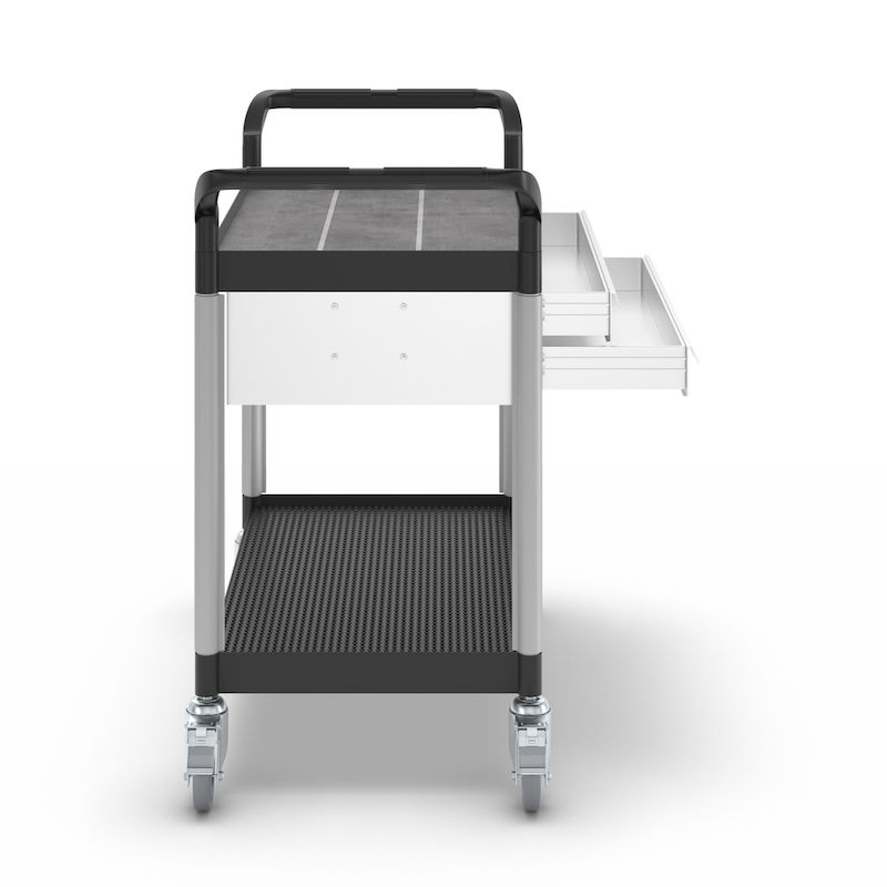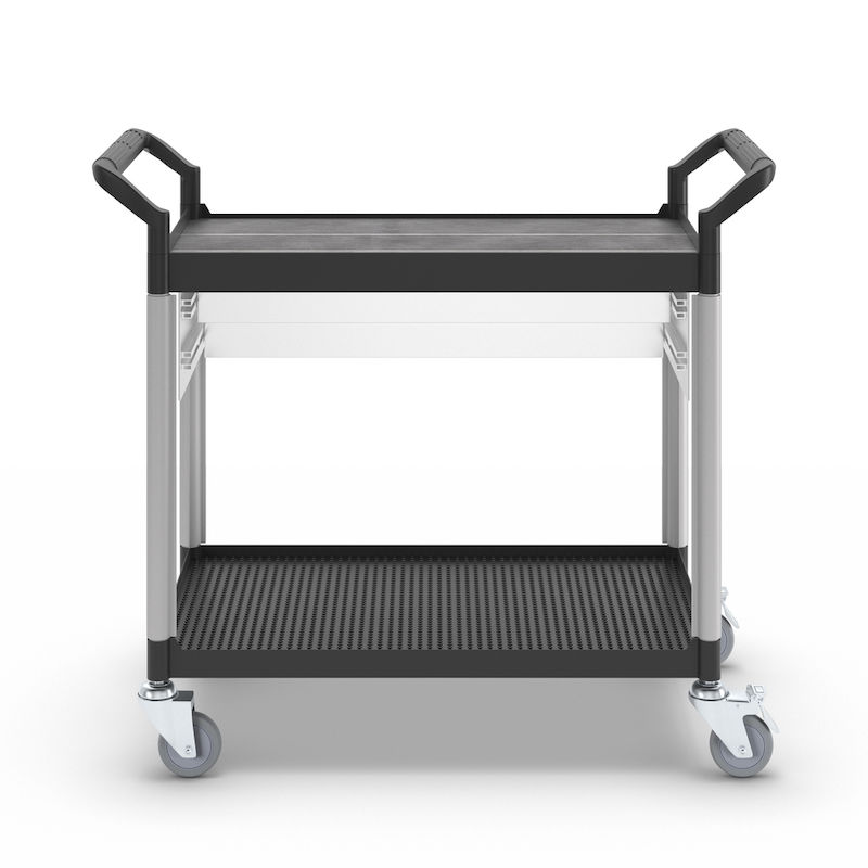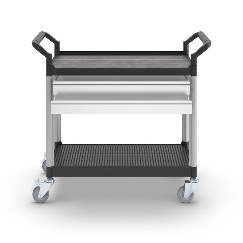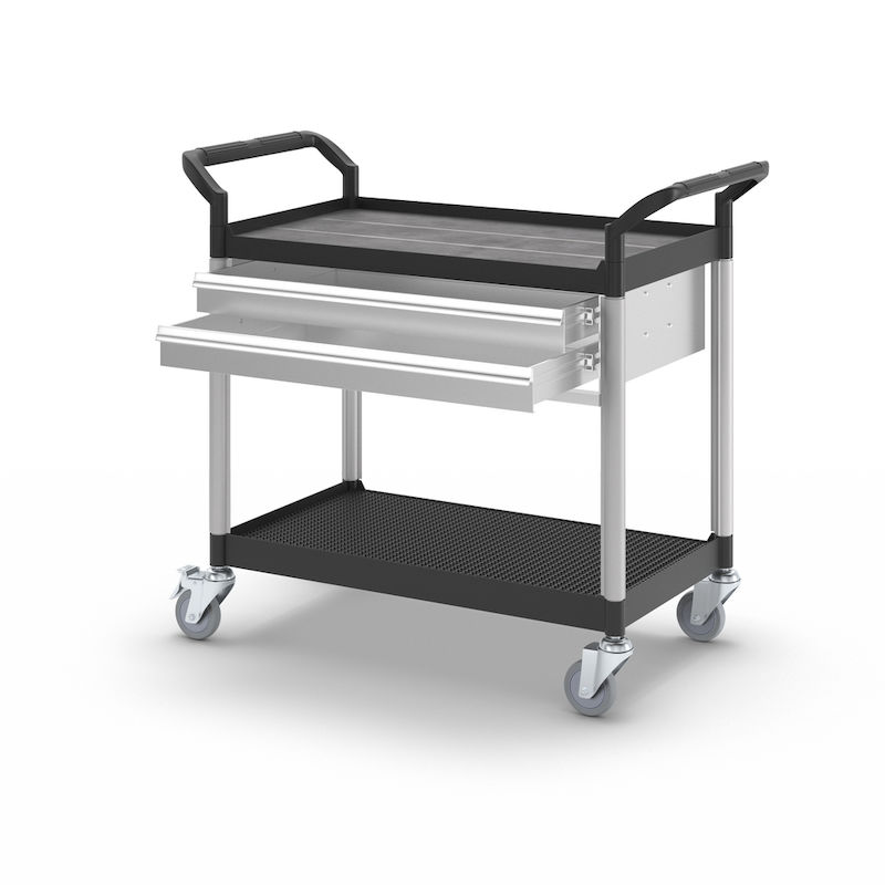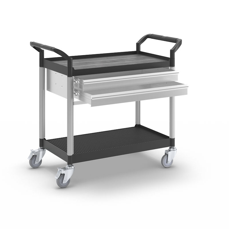 Allroundvogn Pelle, LxBxH 850 x 480 x 950 mm, 2 skuffer, 2 hylder, lastkapacitet 200 kg. Hylder og håndtag af plast. 4 drejelige kvalitetshjul, heraf 2 med bremse. Hjuldiameter 100 mm. Non-marking massive gummihjul.