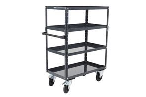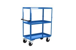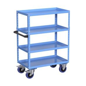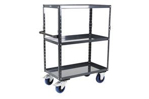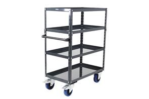 Takket være det intelligente modulprincip har du til enhver tid mulighed for at ændre arbejdsvognen, så den passer til dine individuelle behov. Tilpas vognens opbygning med forskellige hylder, eller vælg mellem vores tre forhåndskonfigurerede varianter med to, tre eller fire etager. Vognen kan tilpasses ved hjælp af tilbehør som fx ekstra bakkehylder og hjørnestolper. Ved hjælp af hulprofilerne er det nemt at placere og variere hylderne i forskellige højder, så de bliver skræddersyet til størrelsen på dit gods og til dine individuelle behov. Den forhåndskonfigurerede arbejdsvogn med tre eller fire etager har en opbygning med ekstra hjørnestolper, så vognen er højere, men til enhver tid kan bygges om til en lavere vogn. Varianten med to bakkehylder giver fx mulighed for at montere en tredje etage i midten. Bakkehylderne med 40 mm høj kant gør det sikkert at håndtere olie og andre væsker, og transporten sker sikkert, da kanten forhindrer dele i at glide ned.