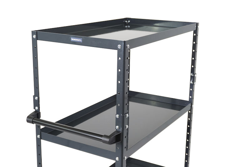 Takket være det intelligente modulprincip har du til enhver tid mulighed for at ændre arbejdsvognen, så den passer til dine individuelle behov. Tilpas vognens opbygning med forskellige hylder, eller vælg mellem vores tre forhåndskonfigurerede varianter med to, tre eller fire etager. Vognen kan tilpasses ved hjælp af tilbehør som fx ekstra bakkehylder og hjørnestolper. Ved hjælp af hulprofilerne er det nemt at placere og variere hylderne i forskellige højder, så de bliver skræddersyet til størrelsen på dit gods og til dine individuelle behov. Den forhåndskonfigurerede arbejdsvogn med tre eller fire etager har en opbygning med ekstra hjørnestolper, så vognen er højere, men til enhver tid kan bygges om til en lavere vogn. Varianten med to bakkehylder giver fx mulighed for at montere en tredje etage i midten. Bakkehylderne med 40 mm høj kant gør det sikkert at håndtere olie og andre væsker, og transporten sker sikkert, da kanten forhindrer dele i at glide ned.