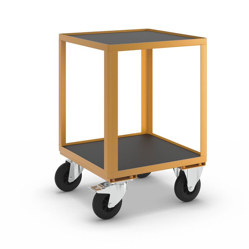 Henholdsvis 2 drejelige og 2 faste hjul, hjuldiameter 160 mm, rullelejer. 1 drejeligt hjul med dobbeltbremse.