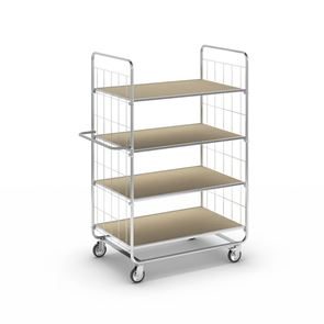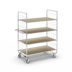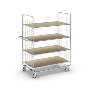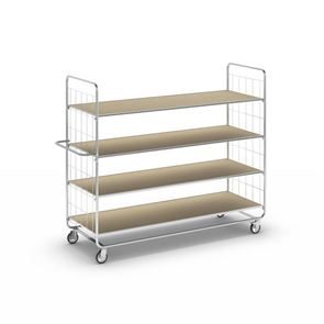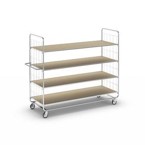 Rullebord Telma, lange versioner, 4 drejelige hjul, 4 hylder, LxBxH 1395 x 470 x 1120 mm, 2 med bremse, fra 5 stk.. Galvaniseret. Hylder, udstyret med ledende belægninger og sikkerhedstestet. 4 letgående drejelige hjul, Ø 125 mm.