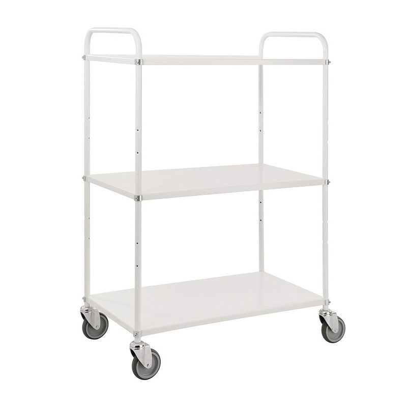Hyldevogn 250 kg, 3 hylder, hvid, LxBxH 980x550x1445 mm. Hvide eller blå hyldevogne i pulverlakeret stål. Lastkapacitet 250 kg. Længde 1070 mm. 4 drejelige hjul, Ø 125 mm. Vælg mellem forskellig antal hylder og høj eller lav model. Leveres usamlet.