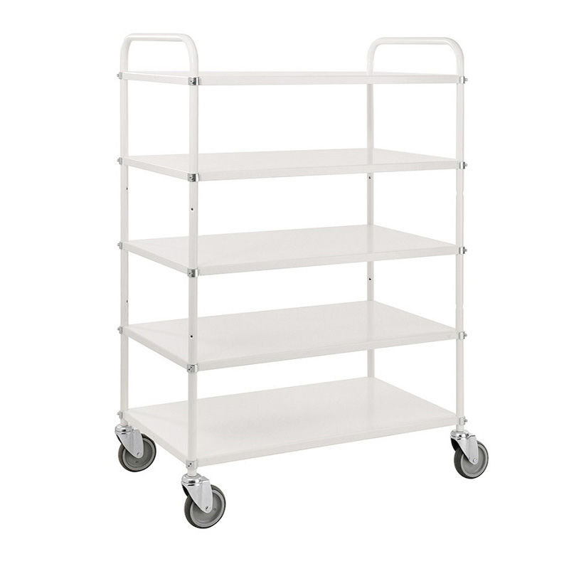 Hyldevogn 250 kg, 5 hylder, hvid, LxBxH 980x550x1445 mm. Hvide eller blå hyldevogne i pulverlakeret stål. Lastkapacitet 250 kg. Længde 1070 mm. 4 drejelige hjul, Ø 125 mm. Vælg mellem forskellig antal hylder og høj eller lav model. Leveres usamlet.