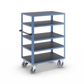 CustomLine Hyldevogn, 5 hylder, med centralbremse, lyseblå RAL 5012. Hyldevognen eurokraft pro er den perfekte løsning til industriens og produktionsvirksomheders individuelle behov. Med dette innovative produkt, der er en del af vores alsidige CustomLine-produktserie, får du fleksibilitet og et modulopbygningsprincip med forskellige kombinationsmuligheder og tilvalgsmuligheder. Værkstedsvognen er en driftssikker partner i dit daglige arbejde, tilpasser sig fleksibelt til dine behov og er medvirkende til at øge effektiviteten i din virksomhed.