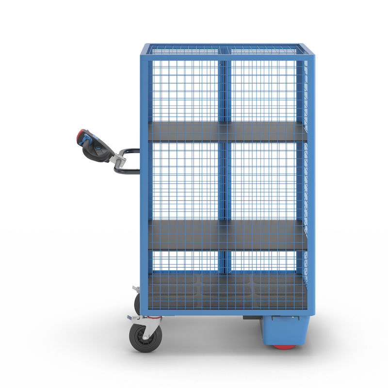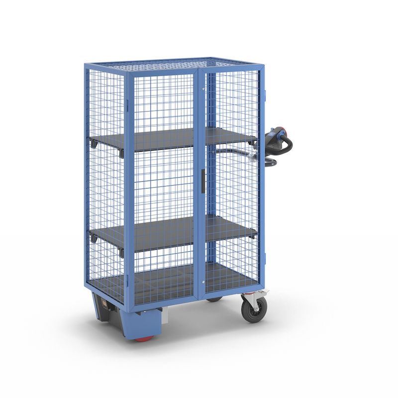 Hyldevognen eurokraft pro med elmotor imponerer med sin robuste konstruktion og mange anvendelsesmuligheder. Denne skabsvogn er ideel til industrielle formål og giver mulighed for struktureret opbevaring, organisering og sikker transport af varer og materialer. Hyldevognen er med en kvalitetspulverlakering og højdejusterbare lastarealer af sort, belagt MDF robust og fleksibel i brug. De forskellige versioner med et til tre lastarealer eller uden lastareal giver dig løsninger på mange behov. Med sidevæggenes gitterstruktur kan du hele tiden se vognens indhold, og der er en god luftcirkulation. Den skridsikre bundplade af genbrugsplast giver en sikker og stabil opbevaring. Den er olieresistent samt stort set syreresistent og vejrbestandig. De drejelige hjul med bremse sikrer vognen, når den er parkeret.