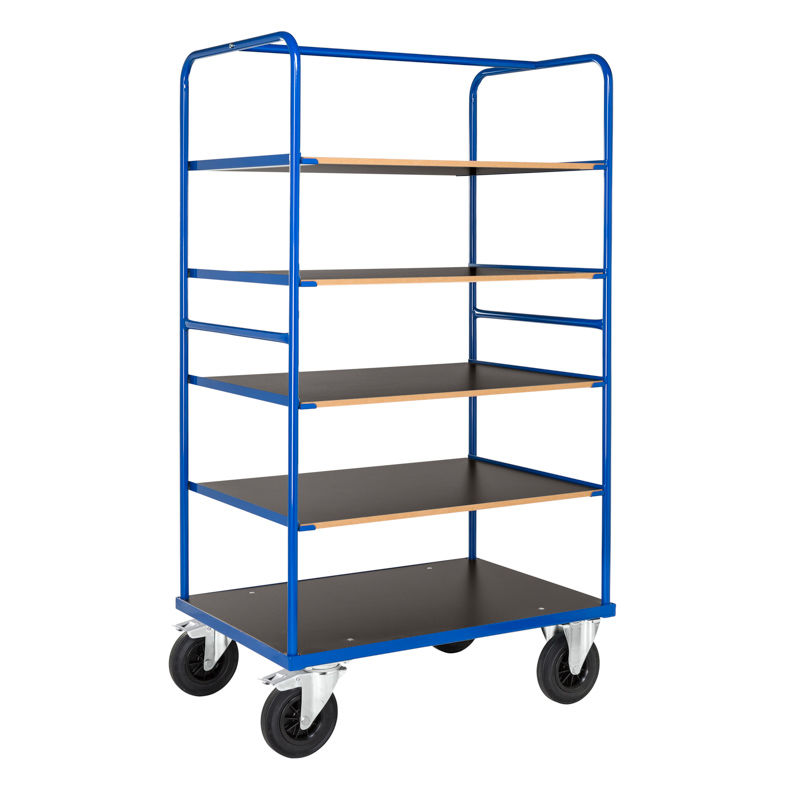 Hyldevogn Grunan, LxBxH 1000x700x1800mm, med bremse, 5 hylder, blå. Stabil pulverlakeret stålkonstruktion. 2 faste hjul og 2 drejelige hjul. Afstand til den første hylde 300 mm. Afstanden mellem hylderne, 300 mm. Maks. belastning 100 kg pr. hylde. Fast håndtag i højden 1040 mm.