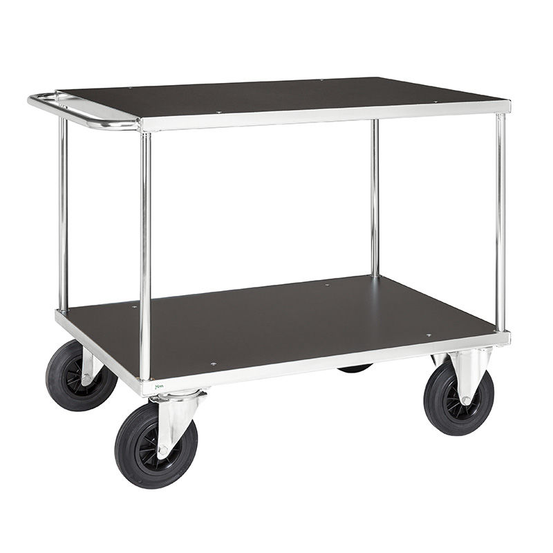Rullebord med elforzinket stålkonstruktion. Hylde/bordplade af MDF-laminat. To faste og to drejelige hjul, Ø 200 mm, af massivt gummi. Kapacitet 500 kg. Leveres usamlet. Højde mellem hylderne: 580 mm.