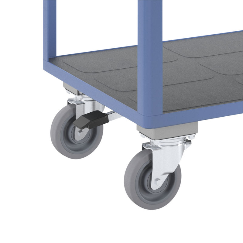Centralbremsen gør det muligt at aktivere bremserne intuitivt og hurtigt ved hjælp af en central pedal. Med kun én handling kan begge de drejelige hjul fastgøres eller udløses på samme tid, hvilket sparer tid og gør arbejdet nemmere. Det centrale bremsesystem kombinerer funktionaliteten og brugervenligheden. I stedet for at betjene to bremser individuelt er en central betjening tilstrækkelig. Pedalen kan nemt skubbes nedad med foden for at låse hjulene og frigives igen med en enkel opadgående bevægelse med foden. Konstruktionen af ​​høj kvalitet med fuldt elastiske hjul giver en støjsvag drift med minimal rullemodstand. De robuste præcisionskuglelejer og slidstærke hjul er driftssikre og er også velegnede til sensible gulve. Systemet, der består af to faste hjul og to drejelige hjul med centralbremse, fås også som tilbehør og er nemt at eftermontere.