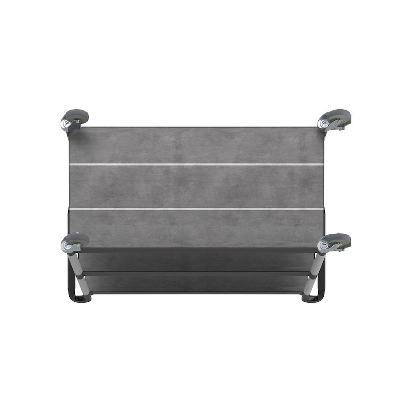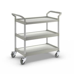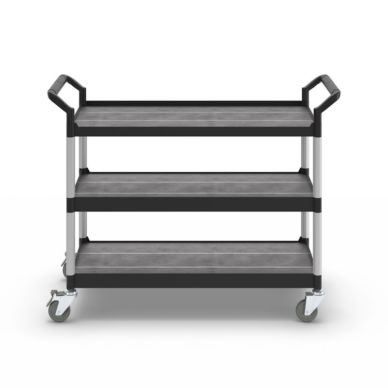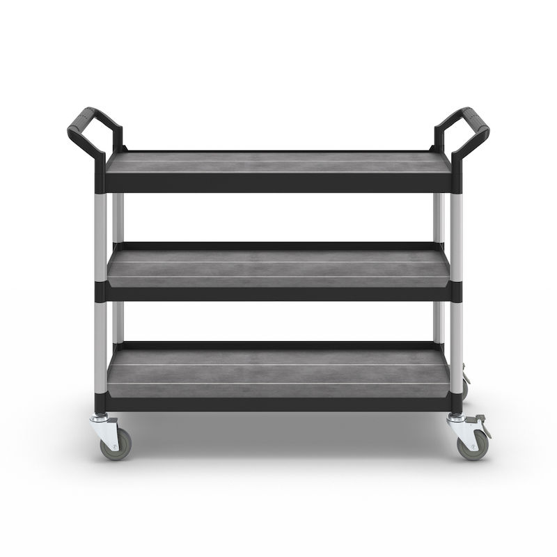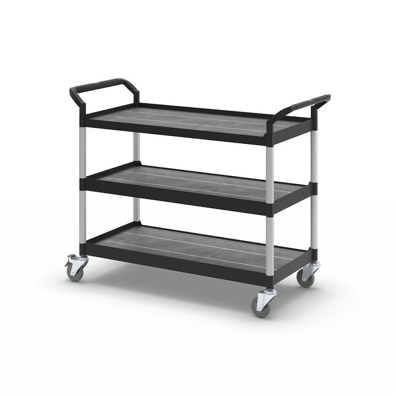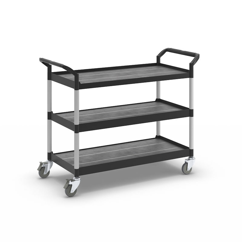 Rullebord Pelle, 3 hylder, lastkapacitet 250 kg, LxBxH 1100 x 520 x 1020 mm, sort. Etager og håndtag af plast. Forstærkede forbindelsesrør af aluminium. 4 drejelige kvalitetshjul, heraf 2 med bremse. Hjuldiameter 100 mm. Non-marking massive gummihjul.