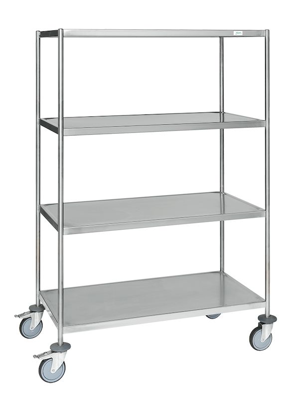 Rustfri hyldevogn Dura, 4 hylder 1050x550 mm, helsvejset. Fuldsvejset rustfri vogn i topkvalitet. Denne model er lidt højere og har fire hylder, og for at være så praktisk som muligt har vognen fire letgående hjul, hvoraf to hjul kan bremses.