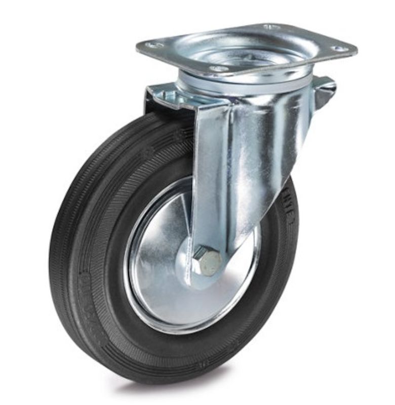 Gummihjul med stålfælg, hjul øxbredde 125x38 mm, drejehjul. På stålfælg Til let og middelstor belastning Temperaturbestandigt fra –5 °C til +60 °C. Hus af galvaniseret-kromateret stålplade. Drejeleje med dobbelt kuglekrans, drejelejebeskyttelse. Fælge af stålplade. glansgalvaniseret. Rullelejer.